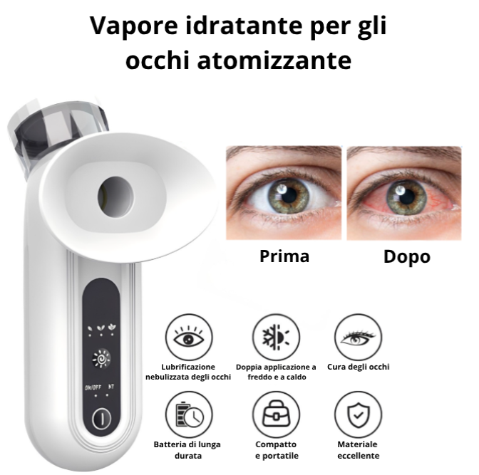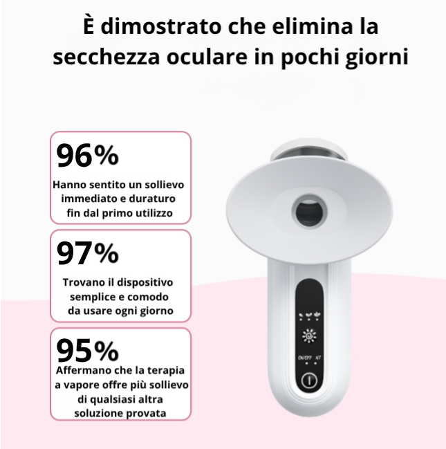 Terapia a vapore approvata dagli optometristi: idrata e allevia gli occhi secchi in meno di 5 minuti. Sicura, delicata e semplice da usare.